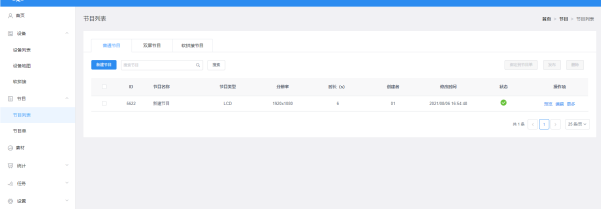 點擊【節目】,進入到節目列表,可對節目重命名、預覽、編輯、復制、發布、歷史記錄、節目創建者、修改時間等操作,如果節目比較多,可以在節目名稱后面的文本框輸入關鍵字,點擊“查詢”按鈕即可,圖3-1。圖3-1節目列表?ID:節目的ID;?節目類型:創建節目時選擇的設備類型;?節目名稱:創建節目的名稱;?分辨率:創建節目的模擬顯示屏的大??;?時長:節目總時長;?創建者:創建節目的用戶名稱;?修改時間:最后編輯節目的時間;?狀態:如果節目內容沒有暴力恐怖、色情違法或敏感詞匯,則為綠色圖標,AI一般可以審核通過;否則為紅色,需要人工再審核才能通過;?操作項:可對節目預覽、編輯、重命名、GPS定點播放、播控...
